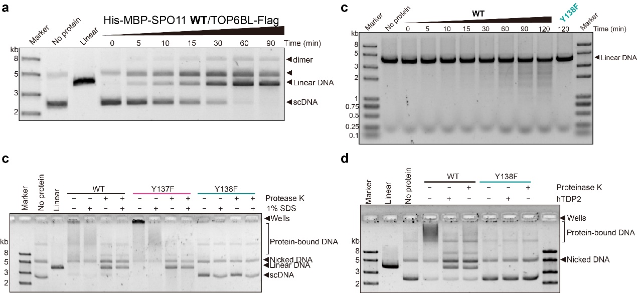 (a)SPO11-TOP6BL對超螺旋質粒的切割實驗,隨著反應時間增加,質粒逐漸被切割成線性(b)SPO11-TOP6BL對線性DNA的切割實驗,隨著反應時間增加,長的線性DNA逐漸被切割成不同長度的DNA片段(c)添加SDS并不能破壞蛋白和DNA的互作,表明SPO11-TOP6BL切割DNA后共價連接在DNA上(d)hTDP2能破壞SPO11和DNA的互作,表明SPO11與DNA的共價連接通過SPO11的Y138殘基和DNA的5'端之間形成的5'磷酸酪氨酸鍵實現