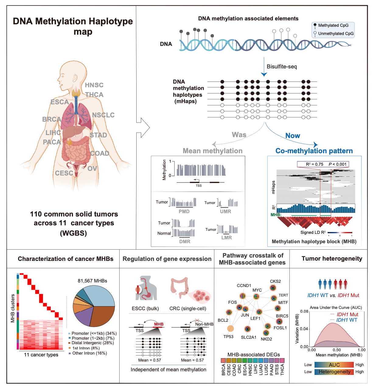 8月23日,國際學(xué)術(shù)期刊Cell Reports在線發(fā)表了中國科學(xué)院分子細(xì)胞科學(xué)卓越創(chuàng)新中心(生物化學(xué)與細(xì)胞生物學(xué)研究所)石建濤研究員與上海交通大學(xué)醫(yī)學(xué)院附屬瑞金醫(yī)院方海教授的最新研究成果“Toward the DNA methylation haplotype map of 11 common solid cancers”。該研究通過全基因組亞硫酸鹽測序(WGBS),繪制了11種中國人群常見實(shí)體瘤的DNA甲基化單體圖譜(DNA methylation haplotype map),并鑒定出81,567個DNA甲基化單體水平上的共甲基化區(qū)間,稱為DNA甲基化單體塊(Methylation Haplotype Blocks, MHBs)。大規(guī)模數(shù)據(jù)整合分析表明,腫瘤MHB富集了腫瘤特異性調(diào)控元件,和腫瘤細(xì)胞的基因表達(dá)調(diào)控顯著相關(guān),也能作為腫瘤液體活檢的標(biāo)志物。